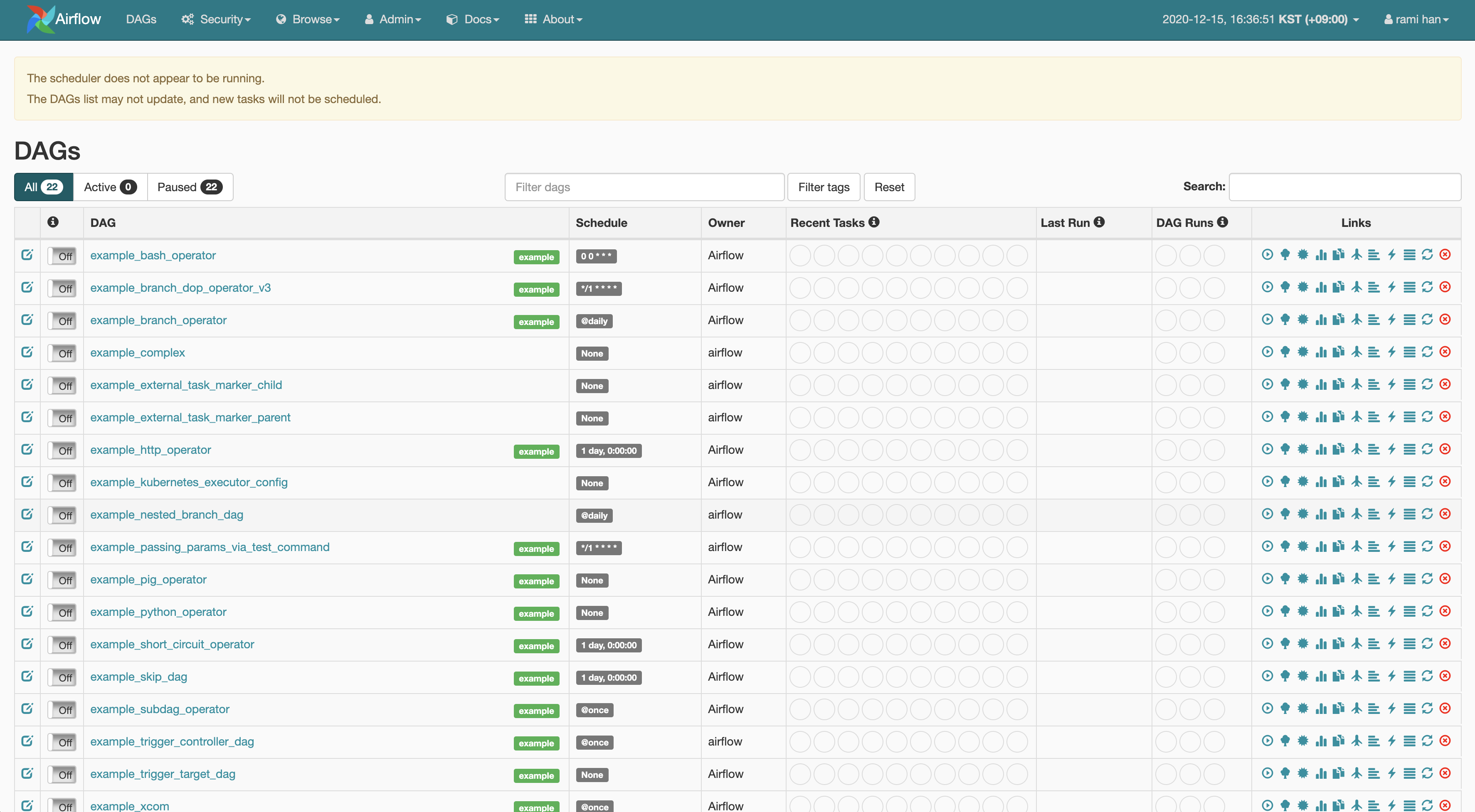 airflow create_user -r Admin -u username -f firstname -l lastname -p password -e email@address.com다시 웹서버를 실행하고 로그인하면 아래와 같이 Dag를 확인할 수 있습니다.