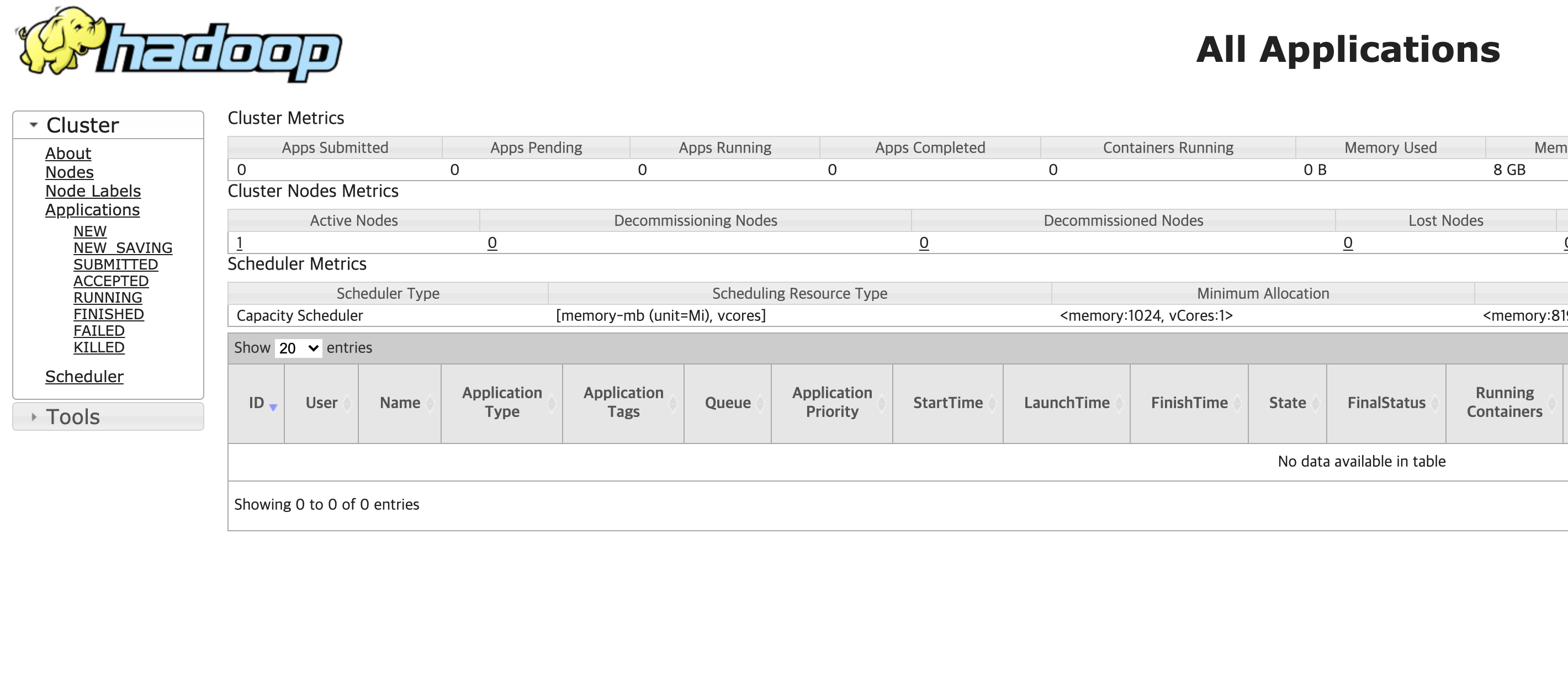 <root 계정> apt-get install -y openssh-server openssh-client net-tools <hadoop 계정> ssh-keygen -t rsa -b 4096 -C "{email Address}" -f ~/.ssh/id_rsa cd ~/.ssh cat id_rsa.pub >> authorized_keys <root 계정> mkdir ~/var/run/sshd sed -i 's/#Port 22/Port 22/g' /etc/ssh/sshd_config vi /etc/ssh/sshd_config #수정 PermitRootLogin yes #prohibit-password PasswordAuthentication yes UseLogin yes sudo passwd root <hadoop 계정> #test ssh localhost <root 계정> service ssh start (sub node에서도 실행)vi ~/.bashrc #autorun /usr/sbin/sshd source ~/.bashrcstart-all.sh{host 주소}:8088 로 접속하면 아래와 같은 Resource Manager 페이지가 나타납니다.