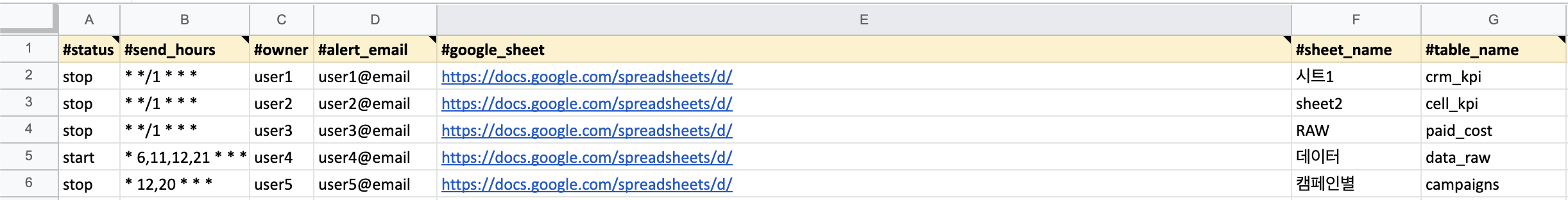 def gs_auth() : # 구글 API 인증 scope = ['https://spreadsheets.google.com/feeds', 'https://www.googleapis.com/auth/drive'] credentials = ServiceAccountCredentials.from_json_keyfile_name( 'google_api_key.json', scope) gc = gspread.authorize(credentials) return gc - DB화 할 시트들을 또 하나의 스프레드시트 안에 목록으로 정리하고 읽어 옵니다.