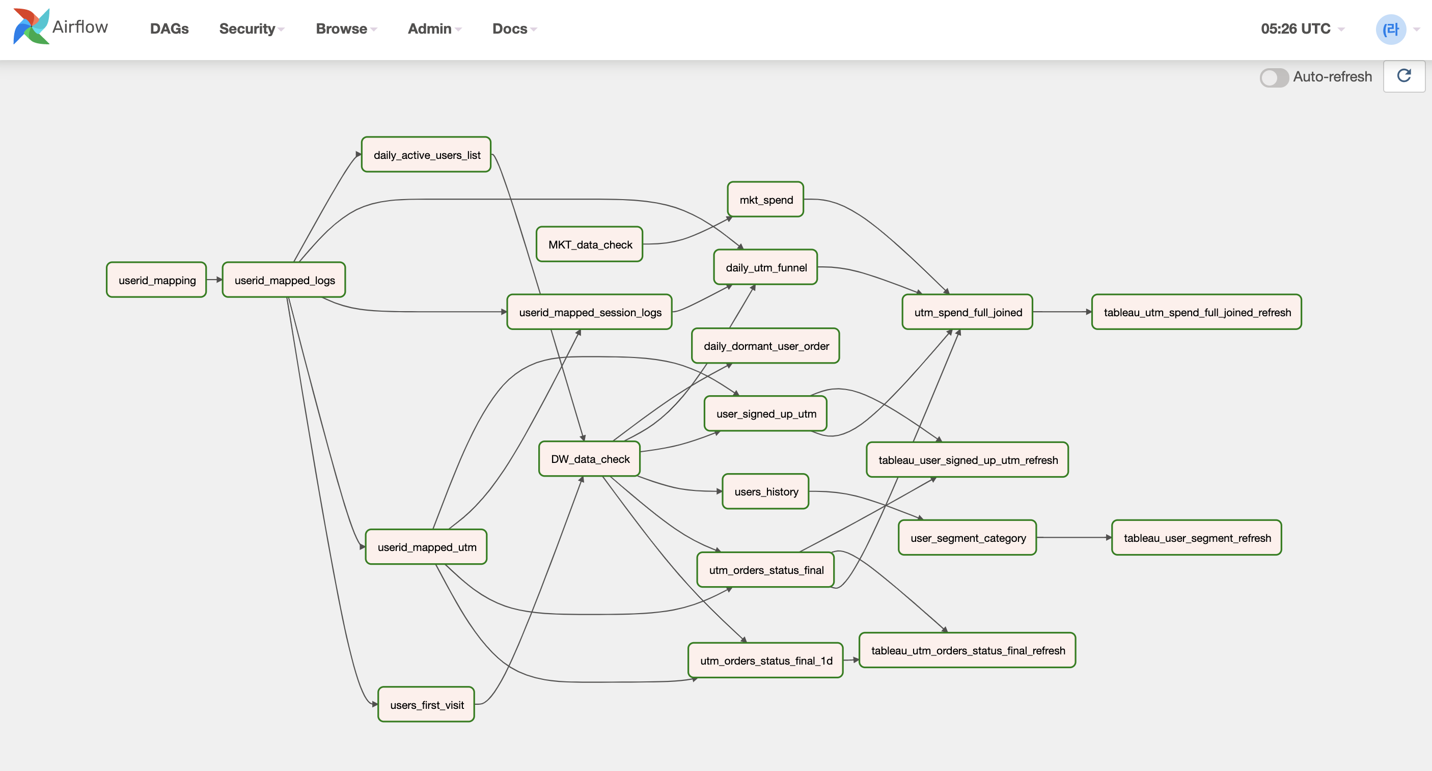 [userid_mapped >> userid_mapped_logs] >> daily_utm_funnel [userid_mapped >> userid_mapped_logs] >> daily_active_users_list >> DW_data_check [userid_mapped >> userid_mapped_logs] >> users_first_visit >> DW_data_check [userid_mapped >> userid_mapped_logs >> userid_mapped_utm] >> user_signed_up_utm [userid_mapped_logs, userid_mapped_utm] >> userid_mapped_session_logs userid_mapped_utm >> utm_orders_status_final userid_mapped_utm >> utm_orders_status_final_1d userid_mapped_session_logs >> daily_utm_funnel DW_data_check >> [utm_orders_status_final, user_signed_up_utm] >> utm_spend_full_joined DW_data_check >> utm_orders_status_final_1d DW_data_check >> daily_dormant_user_order DW_data_check >> users_history >> user_segment_category >> tableau_user_segment DW_data_check >> daily_utm_funnel >> utm_spend_full_joined MKT_data_check >> mkt_spend >> utm_spend_full_joined utm_spend_full_joined >> tableau_utm_spend_full_joined_refresh [utm_orders_status_final, utm_orders_status_final_1d] >> tableau_utm_orders_status_final_refresh user_signed_up_utm >> tableau_user_signed_up_utm_refresh utm_orders_status_final >> tableau_user_signed_up_utm_refreshAirflow를 통한 마케팅 데이터 파이프라인 관리의 효용성